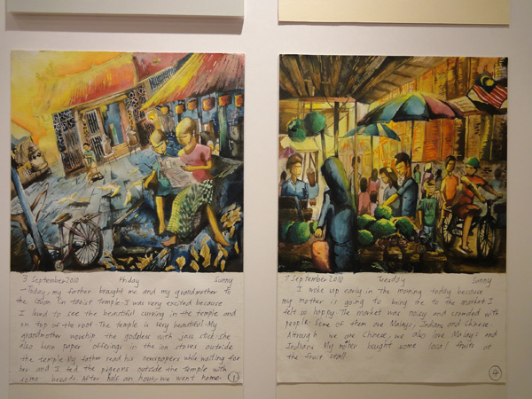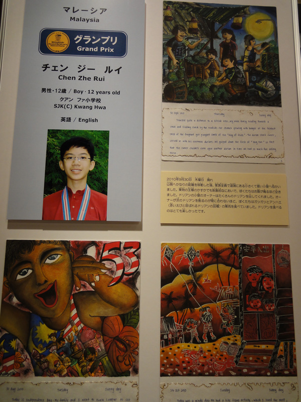 10月14 みんな上手すぎ! Posted on 2011年10月14日 by M. A みんな上手すぎ! 【アジアの子どもだちの絵日記展】 三菱とユネスコが主催して、1990年から開催している、アジアの子どもたちの文化交流事業。アジア24の国や地域の6歳から12歳までの子どもたちの力作が勢揃いしていました。 今回のテーマは「伝えたいな、私の生活」だそうですが、まあ凄い!自分たちの実生活がヒシヒシと伝わってくるその描写力に脱帽です!! ちなみに・・・この子は絶対12歳以下じゃない!!!